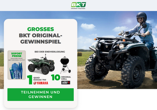 BKT sell-out campaign Gewinnspiel mit Einkauf und Endziehung Promoter: BKT EUROPE SrlProduzieren: BKT FLOTATION Radialreifen und BKT AGRIMAX Agricoltura RadialreifenPreis: Yamaha Quad, BBQ WeberLänder beteiligt: Österreich, Deutschland, Belgien, Luxemburg, Niederlande, Tschechien, Slovakkei und SchweizDauer: März – September 2022 READ THE FULL CASE HISTORY ON OUR ENGLISH BLOG