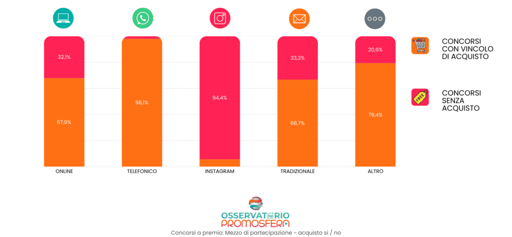 Concorsi a premio: dati e tendenze 2024 12 February 2025 Panoramica sui concorsi a premio in Italia dall’Osservatorio Promosfera L’Osservatorio Promosfera presenta i risultati della nuova analisi sui concorsi a premio in Italia, evidenziando le tendenze chiave del 2024 e approfondendo le evoluzioni più significative e le dinamiche emergenti del settore. L’analisi dell’Osservatorio Promosfera sui concorsi a premio fornisce una visione dettagliata delle iniziative organizzate nel nostro paese nel 2024, prendendo in esame un campione rappresentativo di 1157 concorsi che copre indicativamente il 30% degli eventi regolamentati. I dati sono stati raccolti durante tutto il 2024 ed elaborati nel mese di gennaio per poter prendere in esame tutto il periodo annuale completo. In questo articolo: TREND DELLE MANIFESTAZIONI A PREMIO IN ITALIA NEGLI ULTIMI 6 ANNI CANALI DI PARTECIPAZIONE AI CONCORSI A PREMI MODALITÀ DI ASSEGNAZIONE DEI PREMI DEL CONCORSO SETTORE DI MERCATO DEL PROMOTORE DEL CONCORSO A PREMI PREMI PIÙ SCELTI PER I CONCORSI MONTEPREMI DEI CONCORSI DURATA DEI CONCORSI A PREMIO TREND DELLE MANIFESTAZIONI A PREMIO IN ITALIA NEGLI ULTIMI 6 ANNI CONCORSI A PREMIO OPERAZIONI A PREMIO 💻 CANALI DI PARTECIPAZIONE AI CONCORSI A PREMI La netta maggioranza dei concorsi a premio si svolge online ➡️ CANALE ONLINE 67.8% La preferenza per l’online è riconducibile alla versatilità delle meccaniche che spaziano dai semplici form di registrazione agli instant win, dai minigiochi interattivi alla gamification, riuscendo a soddisfare diversi obiettivi. Al secondo posto, il canale telefonico è fra i più gettonati dalle aziende seppure con molto distacco dall’online ➡️ CANALE TELEFONICO 13% Il canale “telefonico” è particolarmente performante per i concorsi instant win e per i concorsi con acquisto, e include i concorsi: WhatsApp, SMS e concorsi telefonici. A breve distanza seguono i contest Instagram ➡️ CANALE INSTAGRAM 10.5% I concorsi su Instagram si sono evoluti velocemente passando da semplici attività di engagement a veri e propri strumenti di lead generation, grazie all’integrazione di chatbot e automazioni con meccaniche differenti, anche, di vincita istantanea. CANALE DI PARTECIPAZIONE VS VINCOLO DI ACQUISTO Come mostra il grafico, emergono chiare preferenze nei canali scelti per ciascuna tipologia di concorso. Instagram si conferma come il canale preferito per i concorsi SENZA obbligo di acquisto 94,4% concorsi Instagram non richiedono acquisto Il canale “telefonico”, in particolare Whatsapp, si rivela il canale dominante per i concorsi CON obbligo di acquisto 98,1% concorsi telefonici è con acquisto Cosa dicono i consumatori in merito al vincolo di acquisto? Da un sondaggio condotto da Promosfera su un campione di consumatori emerge che il 43% degli intervistati acquista un prodotto se c’è un concorso che mette in palio premi di suo gradimento mentre il 57% partecipa ai concorsi solo se indetti su prodotti che, comunque, avrebbe acquistato. CANALE DI PARTECIPAZIONE VS PREMI I premi sono un prolungamento della user experience di un concorso, e consegnare in premio prodotti che appartengono al brand del promotore è un modo per prolungare la relazione con gli utenti. Ma non sempre i prodotti del promotore sono i più adatti per un concorso di successo, la scelta dipende da tanti fattori fra cui anche il canale di partecipazione. In particolare, osserviamo quanto segue: La maggior parte dei premi del promotore vengono proposti nei canali social ➡️ 46% I premi di terzi sono invece i più frequenti in tutti gli altri canali ➡️ 53-76% Questa distinzione è strettamente legata anche al parametro della gratuità della partecipazione come vedremo più avanti. CANALE DI PARTECIPAZIONE VS SETTORE MERCEOLOGICO DEL PROMOTORE L’analisi dei dati incrociata tra il mezzo di partecipazione e il settore del promotore del concorso rivela che anche la scelta del canale promozionale varia a seconda del settore merceologico del brand. Due dati di spicco: 🏆 MODALITÀ DI ASSEGNAZIONE DEI PREMI DEL CONCORSO Nel 2024 si registra una netta crescita della meccanica Instant Win, che si afferma come la modalità dominante rispetto alle altre. In totale, il 57.9% dei concorsi prevede almeno un’assegnazione premi tramite vincita immediata, un dato che evidenzia l’efficacia e l’attrattiva di questa meccanica. Altra considerazione importante da fare è che, negli ultimi anni, il panorama delle meccaniche promozionali è cambiato radicalmente anche grazie all’evoluzione degli strumenti digitali che hanno reso l’Instant Win facilmente integrabile su molteplici canali, tra cui WhatsApp, Instagram e piattaforme dedicate. Analizzando la ripartizione delle meccaniche, emerge che: I concorsi con solo Instant Win rappresentano il 37.3% del totale. I soli a estrazione finale sono il 29.1%. I concorsi a premio con modalità combinata Instant Win + Estrazione si attestano al 20.6%. Il 13% utilizza altre modalità di assegnazione come Rush & Win, classifiche o giuria. MODALITÀ DI ASSEGNAZIONE: EVOLUZIONE Questo grafico evidenzia un cambiamento sia nelle preferenze dei consumatori, che mostrano una crescente inclinazione verso la gratificazione immediata rispetto all’attesa di un’estrazione finale, sia nei brand che riconoscono i vantaggi di questa modalità che permette di mantenere alta l’attenzione degli utenti e stimolare una partecipazione più immediata e coinvolgente e che si presta in modo particolare quando l’obiettivo della promozione è la spinta all’acquisto. MODALITÀ DI ASSEGNAZIONE VS VINCOLO DI ACQUISTO L’83% dei concorsi Instant Win richiede un acquisto per partecipare e la possibilità di vincere immediatamente rappresenta un forte incentivo all’acquisto, anche impulsivo. Al contrario, Il 63% dei concorsi con Estrazione Finale sono privi del requisito di acquisto ➡️ questo tipo di concorso si presta a obiettivi diversi, anche perché pu