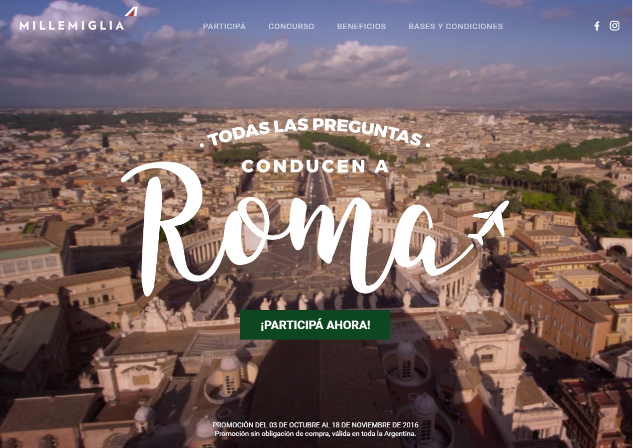 MilleMiglia, il Programma fedeltà di Alitalia, lancia un concorso in Argentina e Messico 13 October 2016 Nuovo concorso a premi per il Programma MilleMiglia di Alitalia “Tutte le domande portano a Roma” è il nuovo concorso che il Programma MilleMiglia, lancia per consolidare la propria presenza in due importanti mercati emergenti, Messico e Argentina. Per coinvolgere, informare e divertire argentini e messicani che amano il nostro Paese e sognano un viaggio nella nostra capitale, a partire dal 3 ottobre e fino al 18 novembre, MilleMiglia ha messo in palio un biglietto aereo di andata e ritorno per due persone fra Roma e la capitale di ciascuno dei paesi coinvolti. Il concorso si è svolto sul sito www.quieroiraroma.com mediante una trivia ludica volta a testare la conoscenza del nostro paese e degli elementi interculturali che ci accomunano. Il concorso, finalizzato a incrementare le iscrizioni al Programma MilleMiglia, è stato progettato e gestito da Promosfera che ha curato anche la campagna digital e il community management su Facebook e Instagram. Vuoi organizzare anche tu un concorso in Messico o Argentina? Contattaci e ti aiuteremo noi.