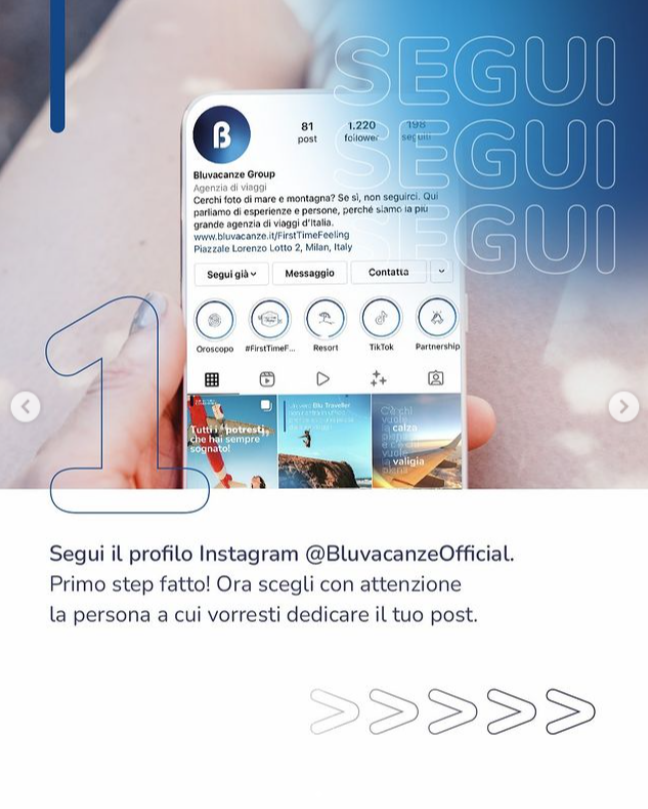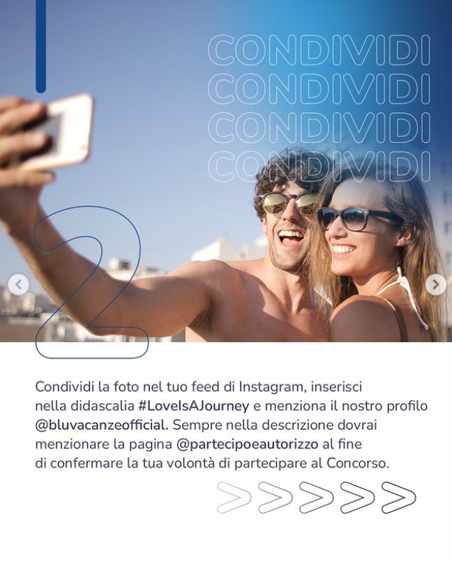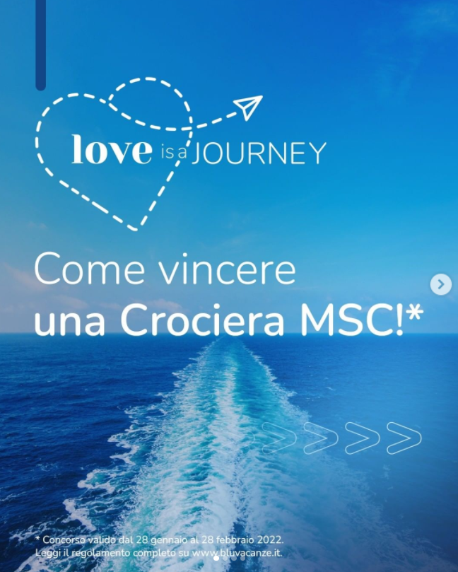 CONTEST BLUVACANZE LOVE IS AN ENDLESS JOURNEY Concorso Instagram M&H Promotore: Bluvacanze SPAMeccanica: Pubblica sul tuo profilo Instagram un contributo che dovrà essere coerente con l’ambito viaggio/vacanze e dovrà rispettare il tema del concorso “La persona del cuore” quella con cui andresti ovunque con la richiesta di indicare, nel testo del post “perché viaggiare con questa persona renda il viaggio un’esperienza indimenticabile”.Premi: crociera MSCValidità: Gennaio-Febbraio 2022 STEP PER PARTECIPARE