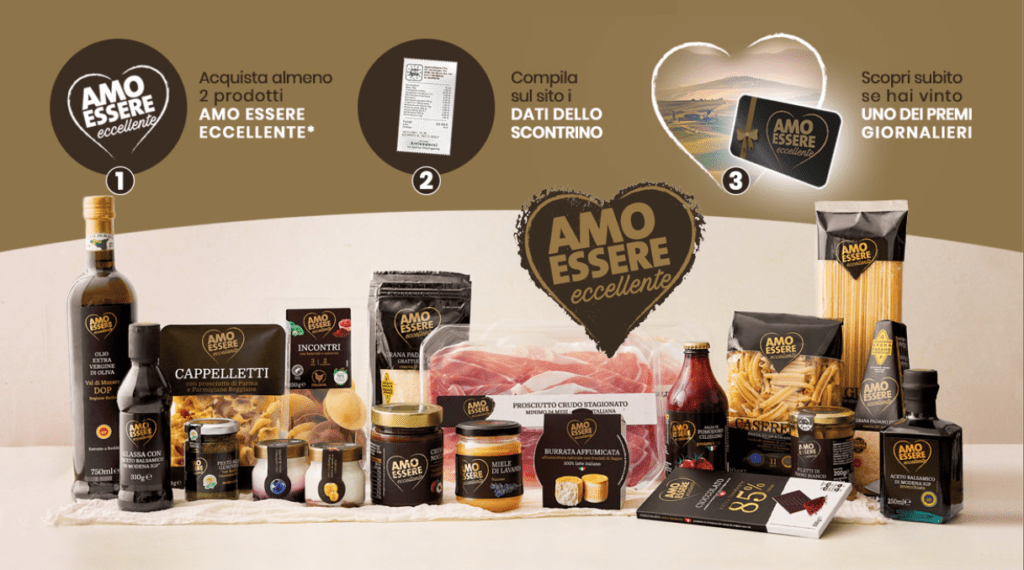 Concorso AMO ESSERE ECCELLENTE 2023 Concorso con acquisto instant win Promotore: Eurospin Italia spaProdotti: prodotti della linea “Amo Essere Eccellente”Premi: Voucher viaggio gourmet, buoni spesa Amo Essere EccellenteValidità: Marzo-aprile 2023Paesi Coinvolti: Italia
