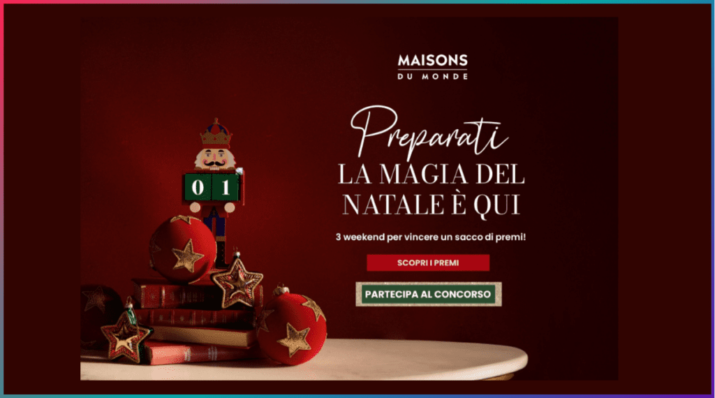 COUNTDOWN NATALE Concorso con minigame ad estrazione giornaliera ed estrazione finale Promotore: Maisons Du Monde Italie S.R.L. Prodotti: marchio Maisons Du Monde Premi: Gift Card MDM da 500€, Gift Card servizio interior design da 249€, selezione di prodotti MDM per la tavola di Natale, specchio bestseller MDM, pacchetto di Gift Card da 2000€ Validità: Novembre – Dicembre 2024 Paesi Coinvolti: Italia