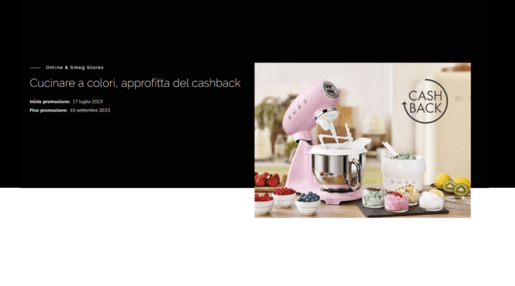Cucinare a colori, approfitta del cashback Cashback Promotore: SMEG S.P.A. Prodotti: Elettrodomestici SMEG (frullatore ad immersione, sbattitore, frullatore, impastatrice) Premi: Rimborso (cashback) da 30 € a 100 € Validità: Luglio – Settembre 2023 Paesi Coinvolti: Italia