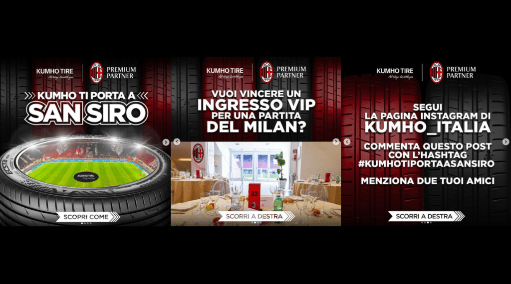 KUMHO ti porta a San Siro Concorso Instagram Promotore: KUMHO Tire France SAS Prodotti: Marchio Kumho Premi: Biglietti partita Milan-Frosinone Validità: Ottobre 2023 Paesi Coinvolti: Italia